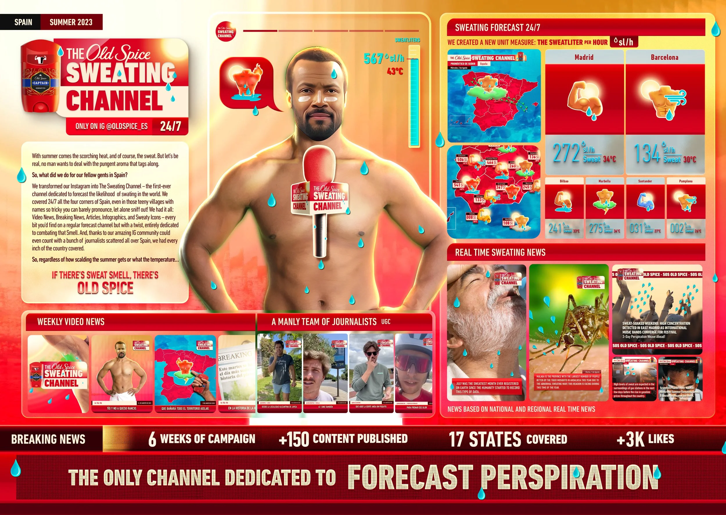 Así que, ¿qué hizo Old Spice por sus colegas españoles? Transformó su Instagram en The Sweating Channel, el primer canal dedicado a predecir la probabilidad de sudar en el mundo. Cubrimos 24 horas al día, 7 días a la semana, los cuatro rincones de España, incluso en esos pueblecitos con nombres tan complicados que apenas se pueden pronunciar, y mucho menos oler.